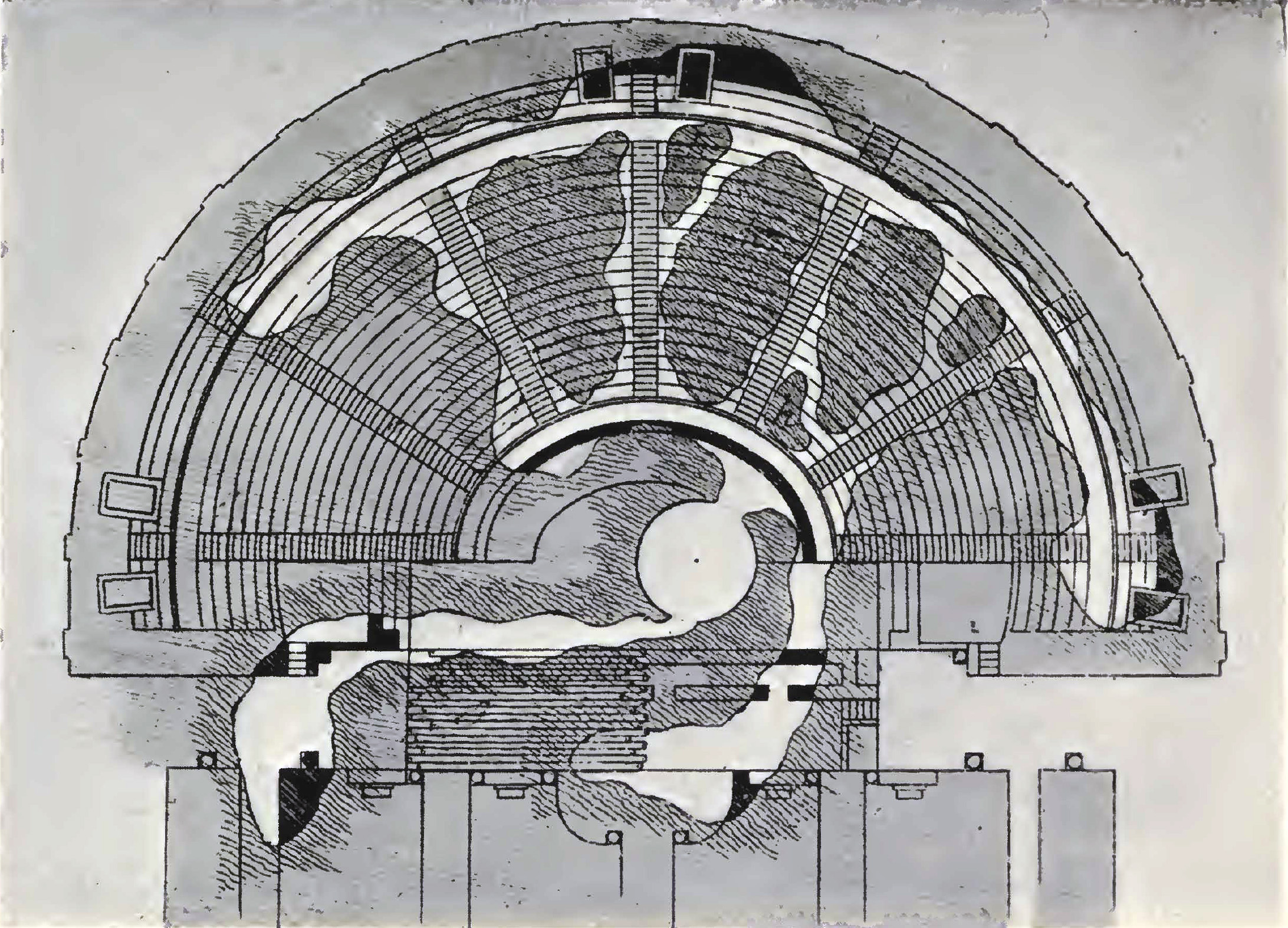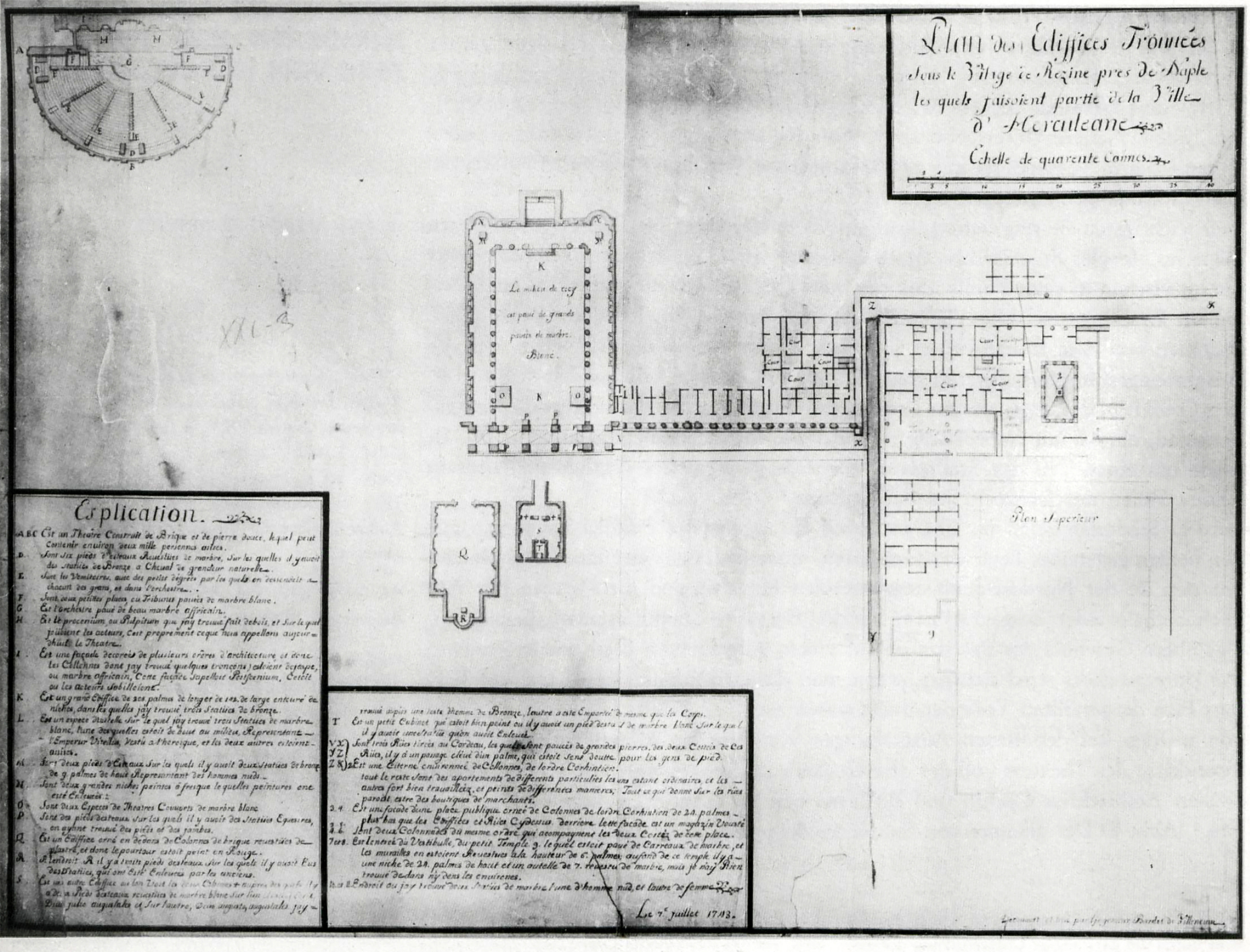 Plan of Herculaneum Theatre with orginal well hole that found it in centre by Bellicard 1754.