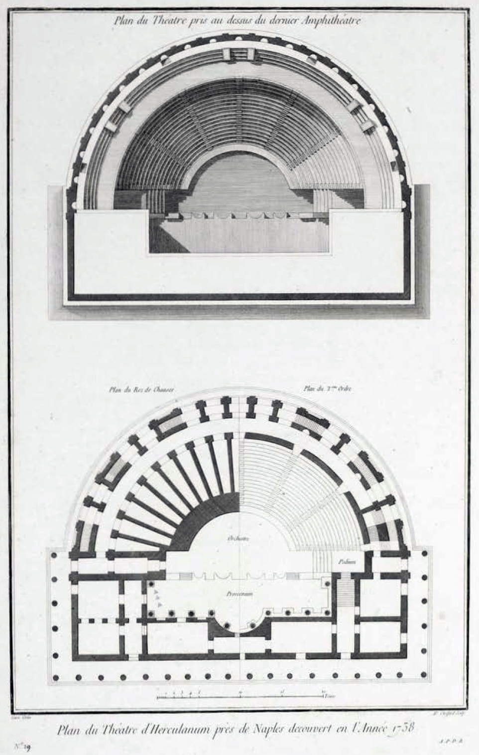 Plan of the theatre at Herculaneum, first of three by Francesco Piranesi published in 1783 in Teatro di Ercolano, Tav I.