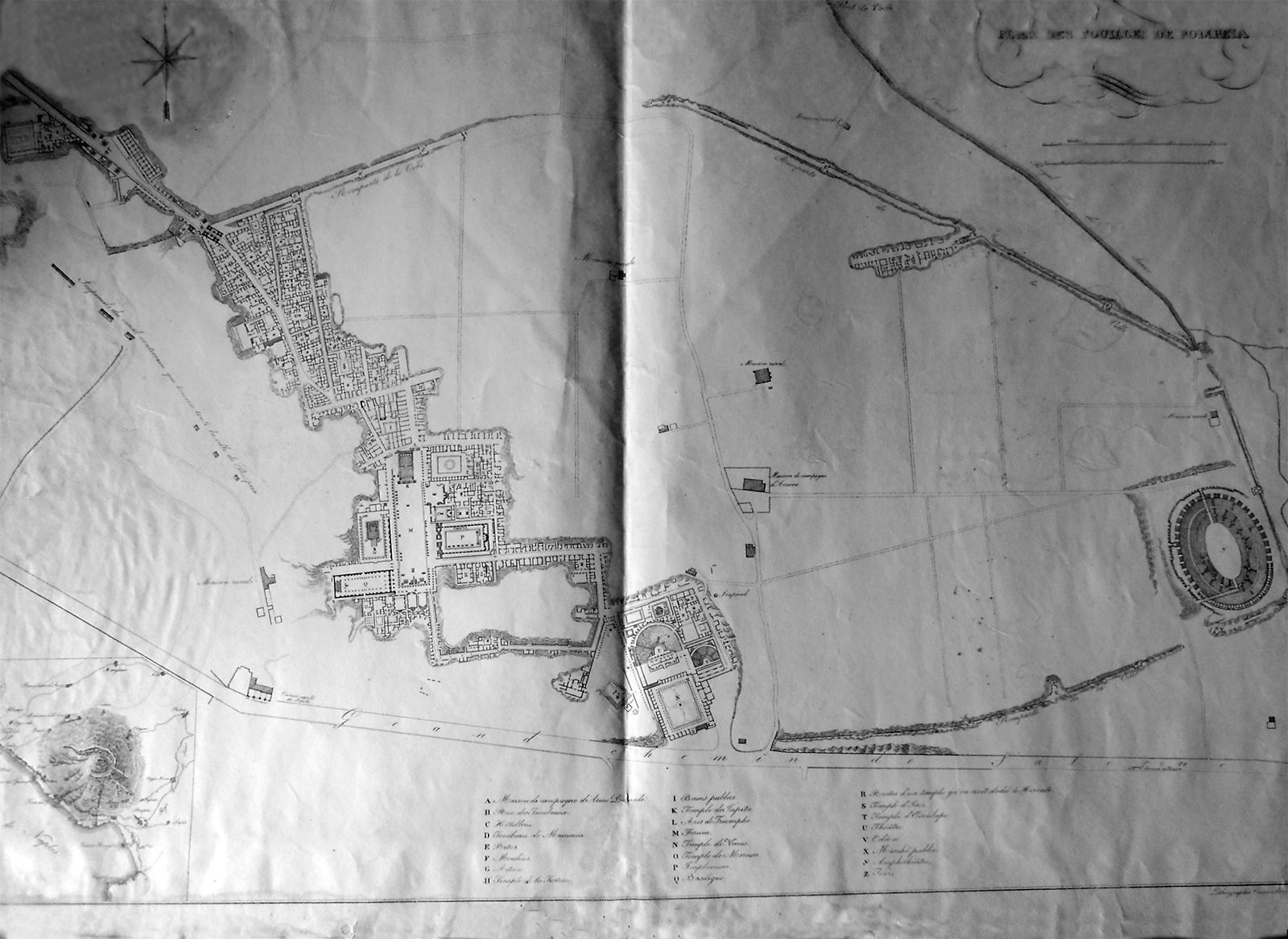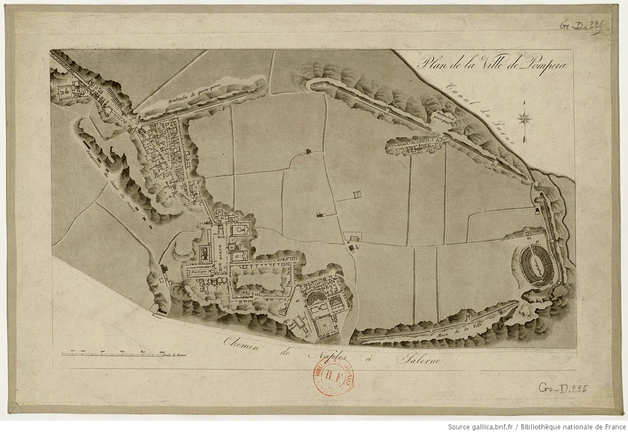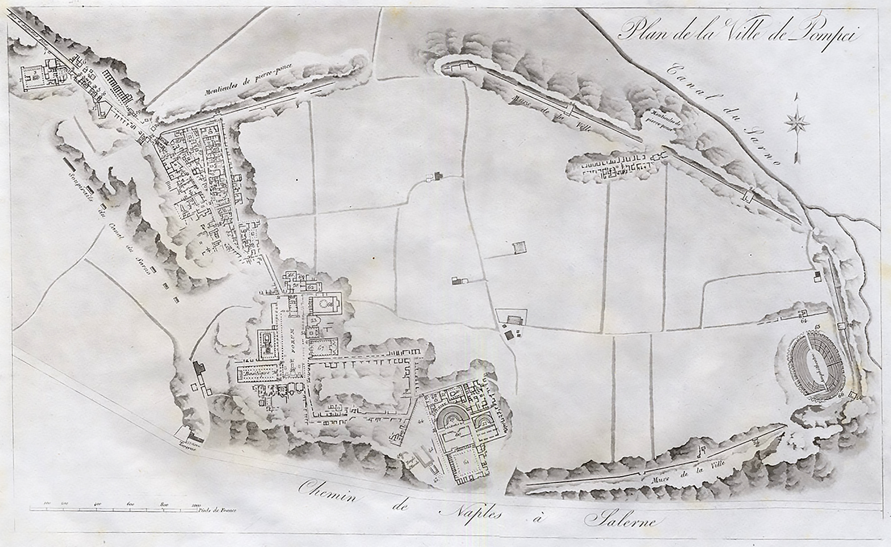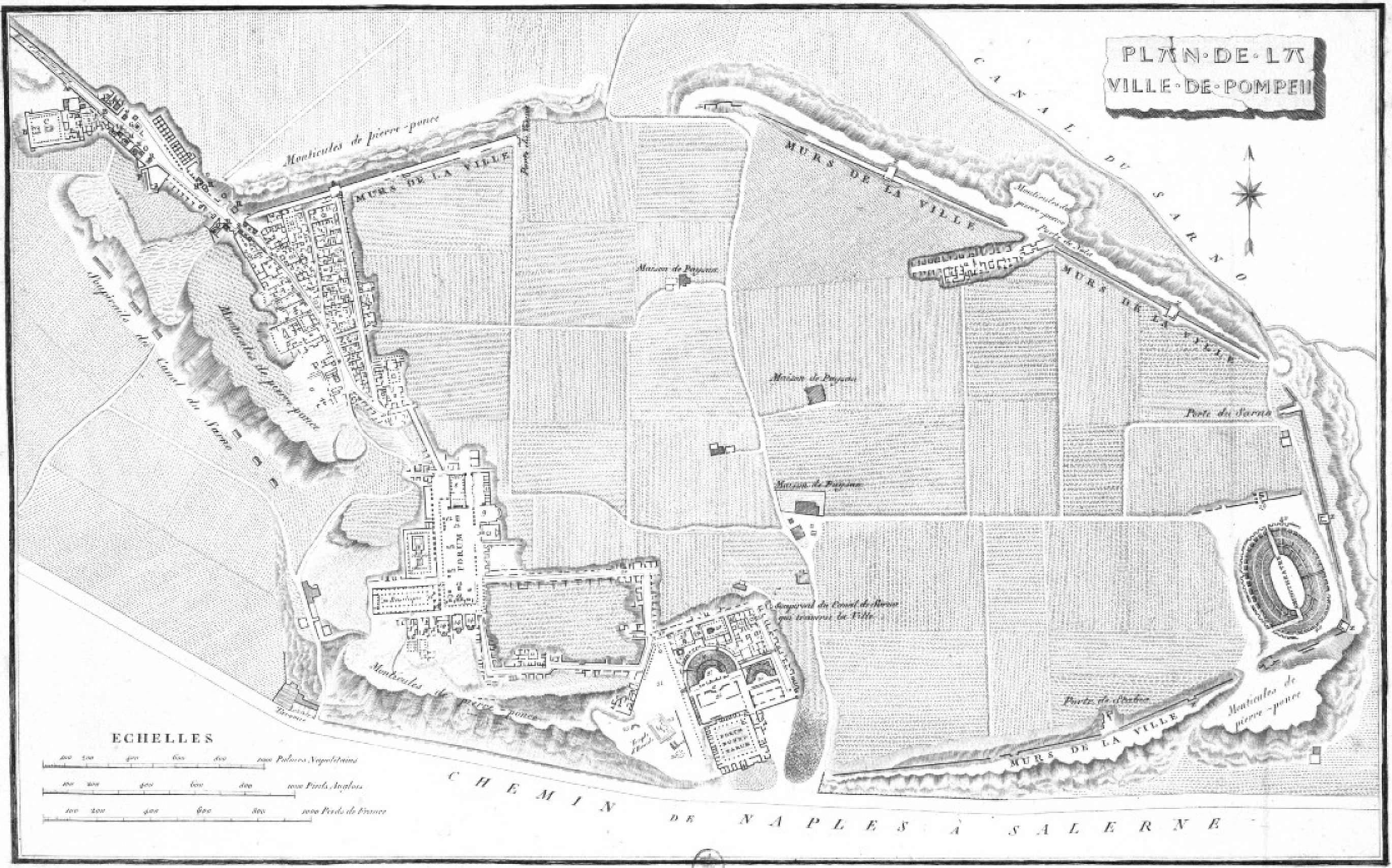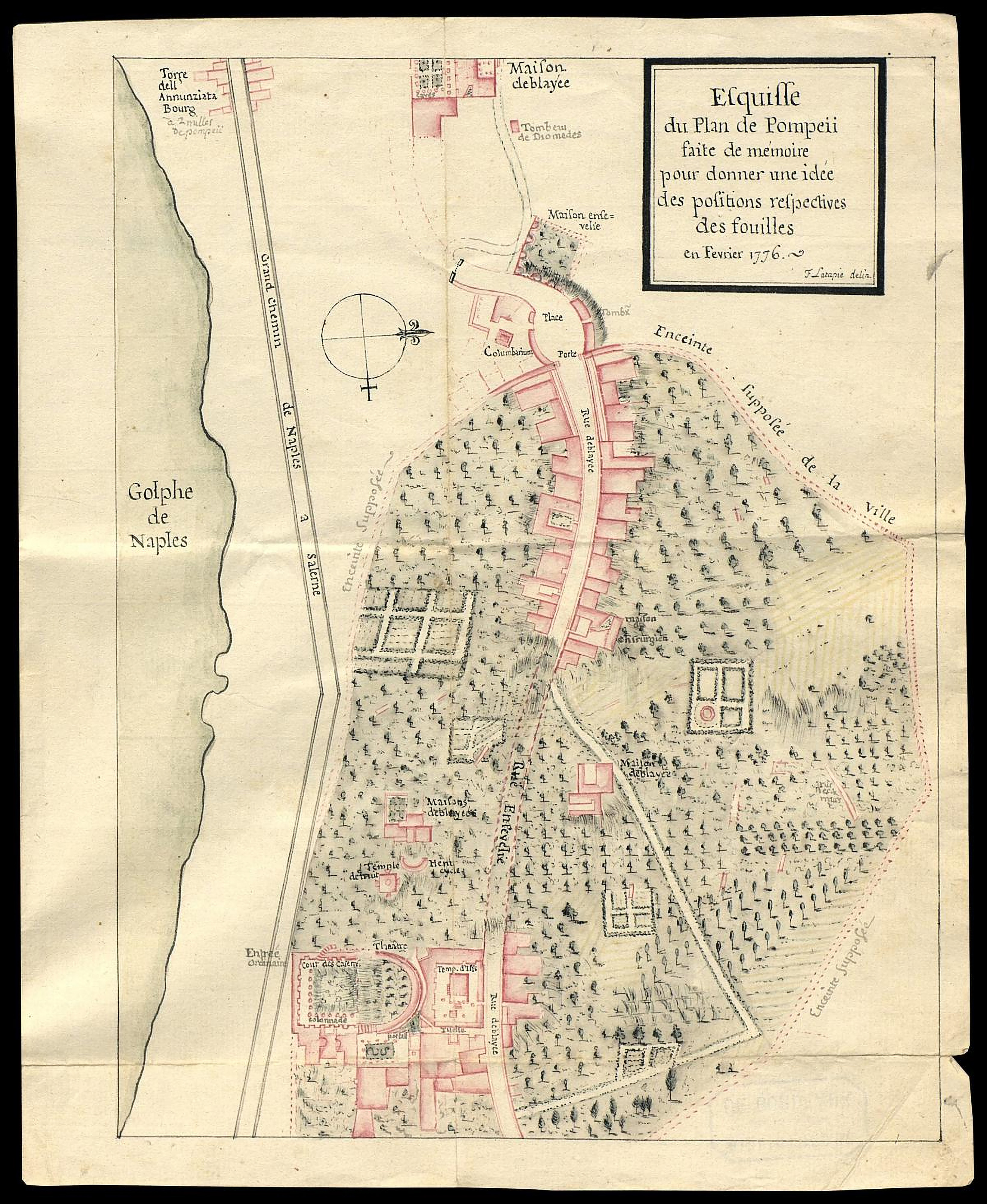 The first plan of Pompeii published in February 1776 by Francois-De-Paule Latapie. He drew the map from memory after visiting Pompeii, as such activities were not allowed during visits at that time, and made a presentation to l’Académie Reale di Scienzi, Lettere ed Arte de Bordeaux.