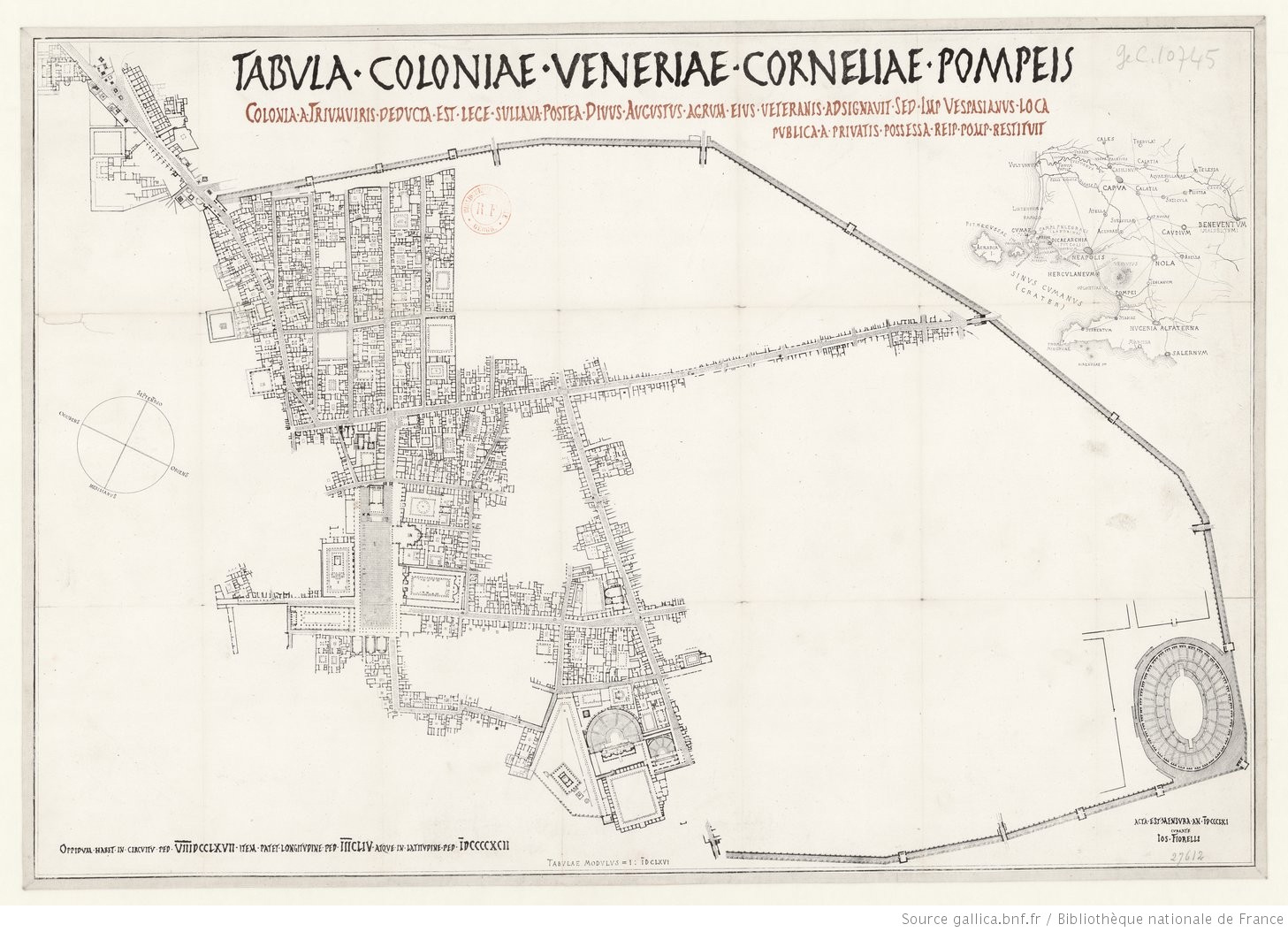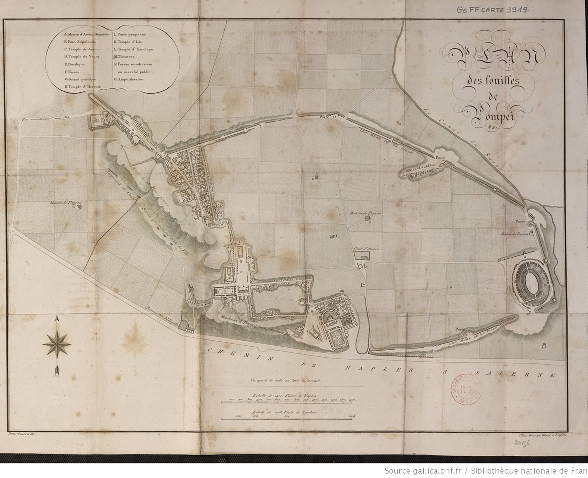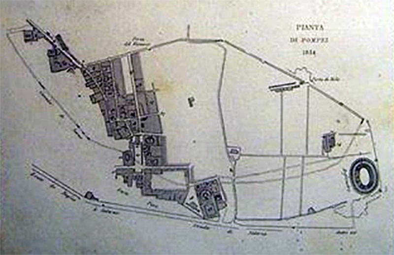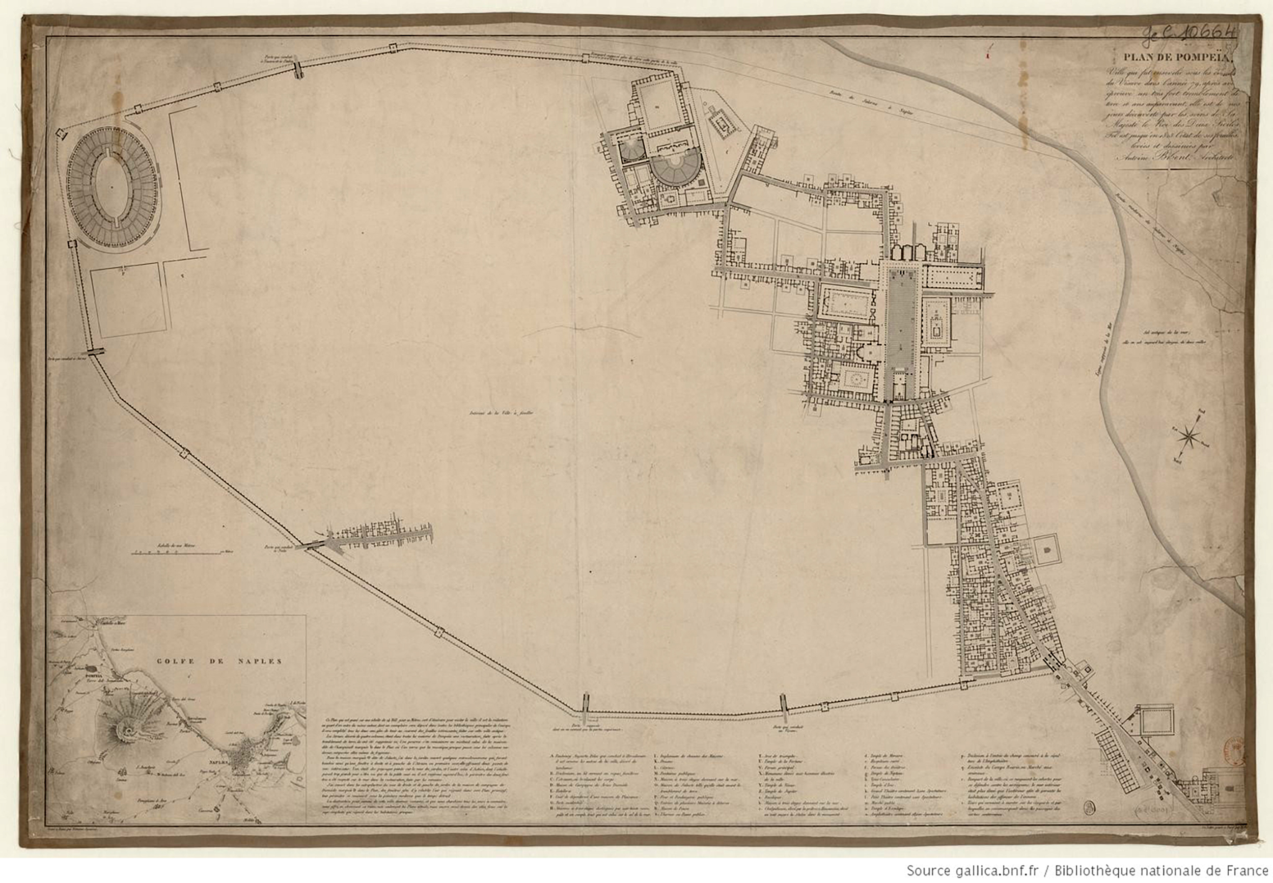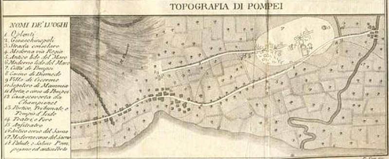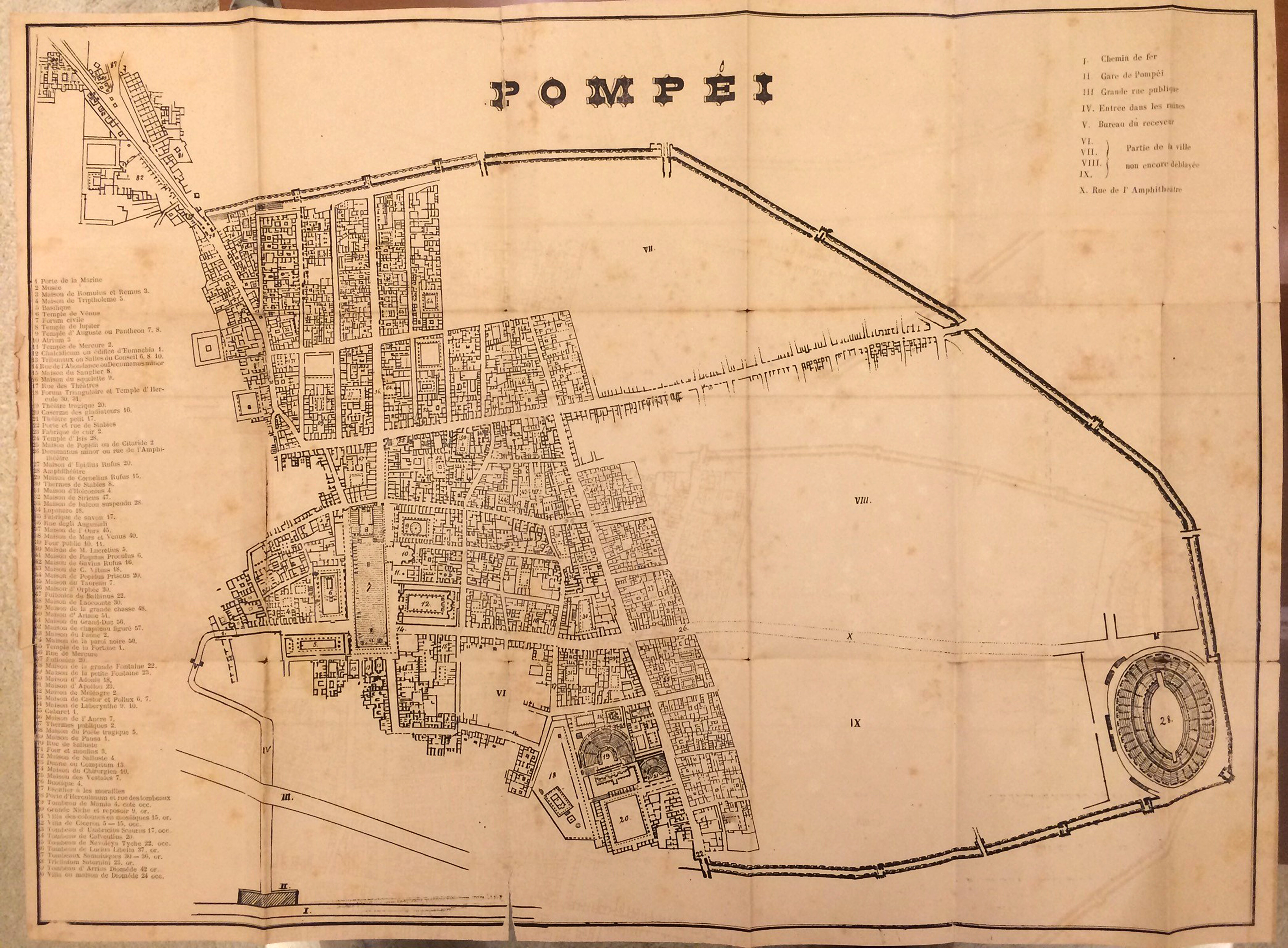 The first plan of Pompeii published in February 1776 by Francois-De-Paule Latapie. He drew the map from memory after visiting Pompeii, as such activities were not allowed during visits at that time, and made a presentation to l’Académie Reale di Scienzi, Lettere ed Arte de Bordeaux.