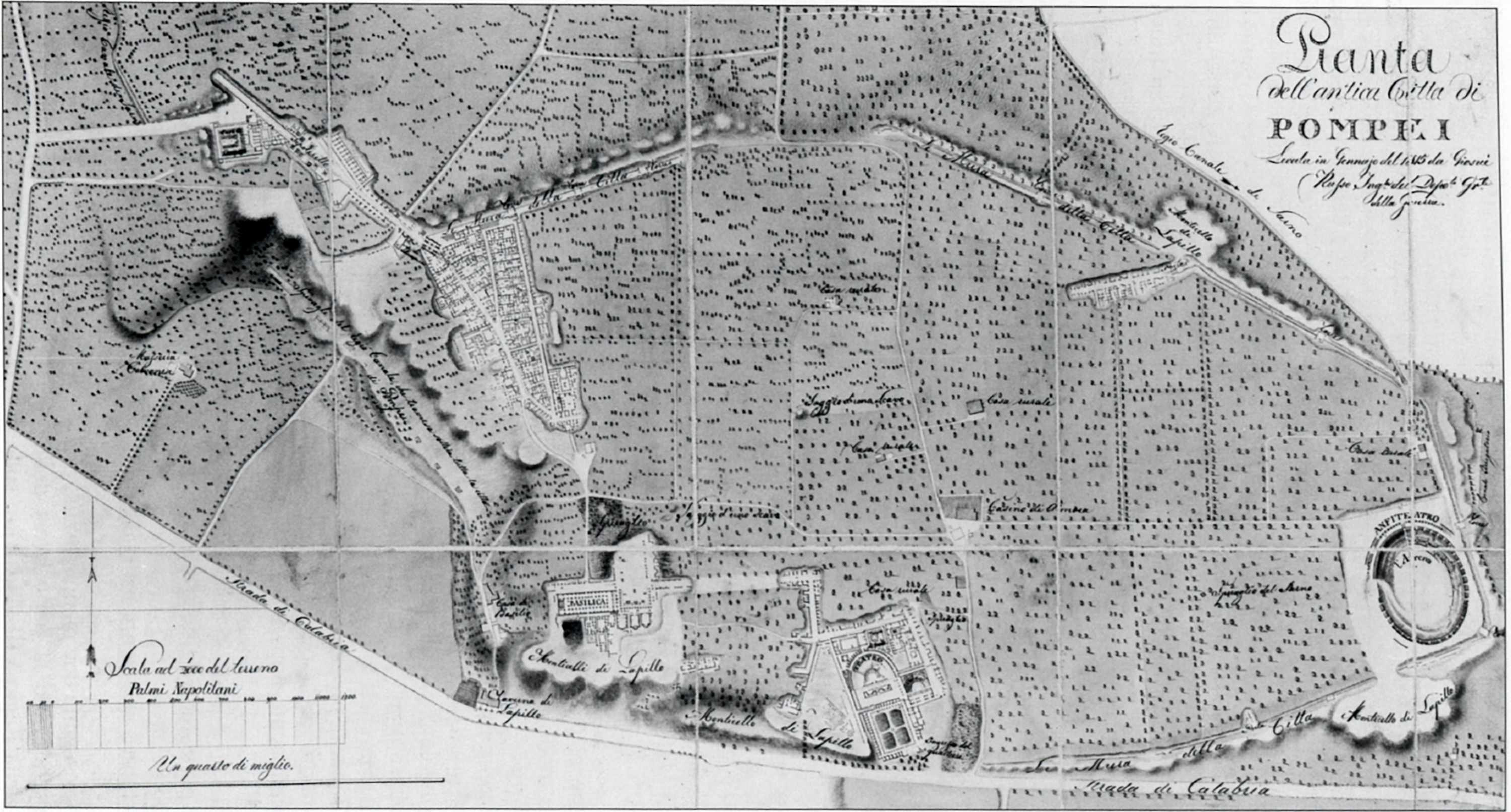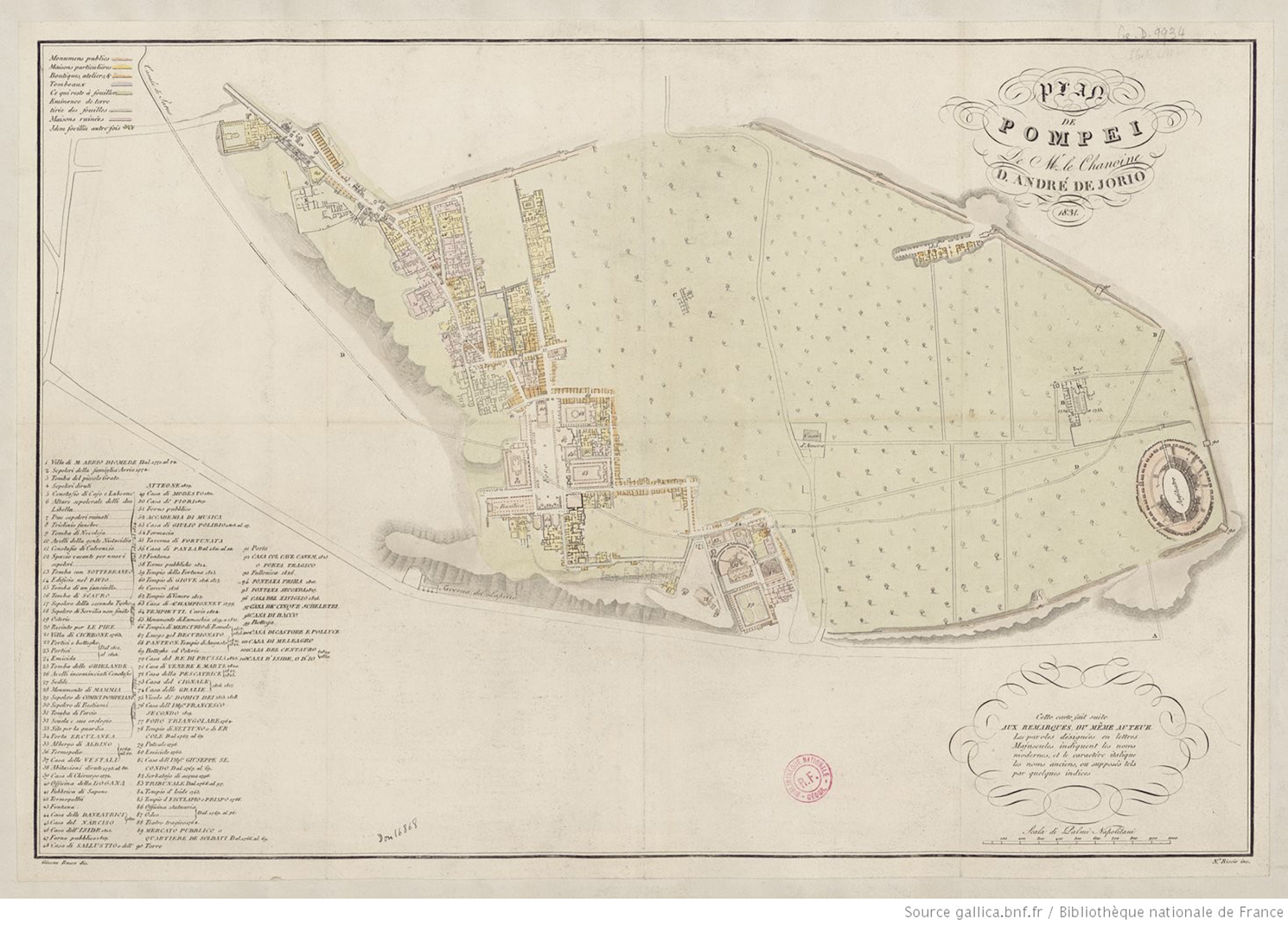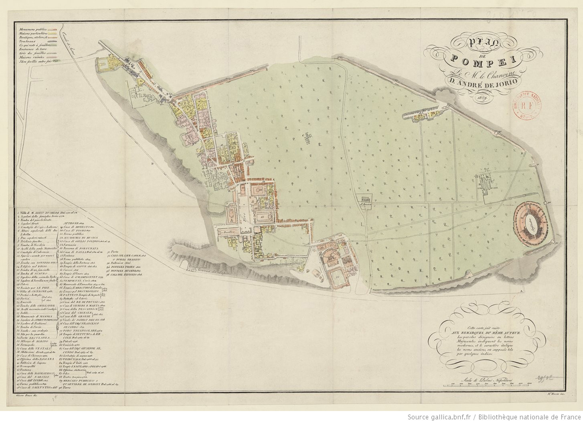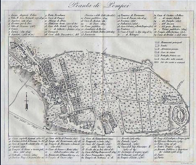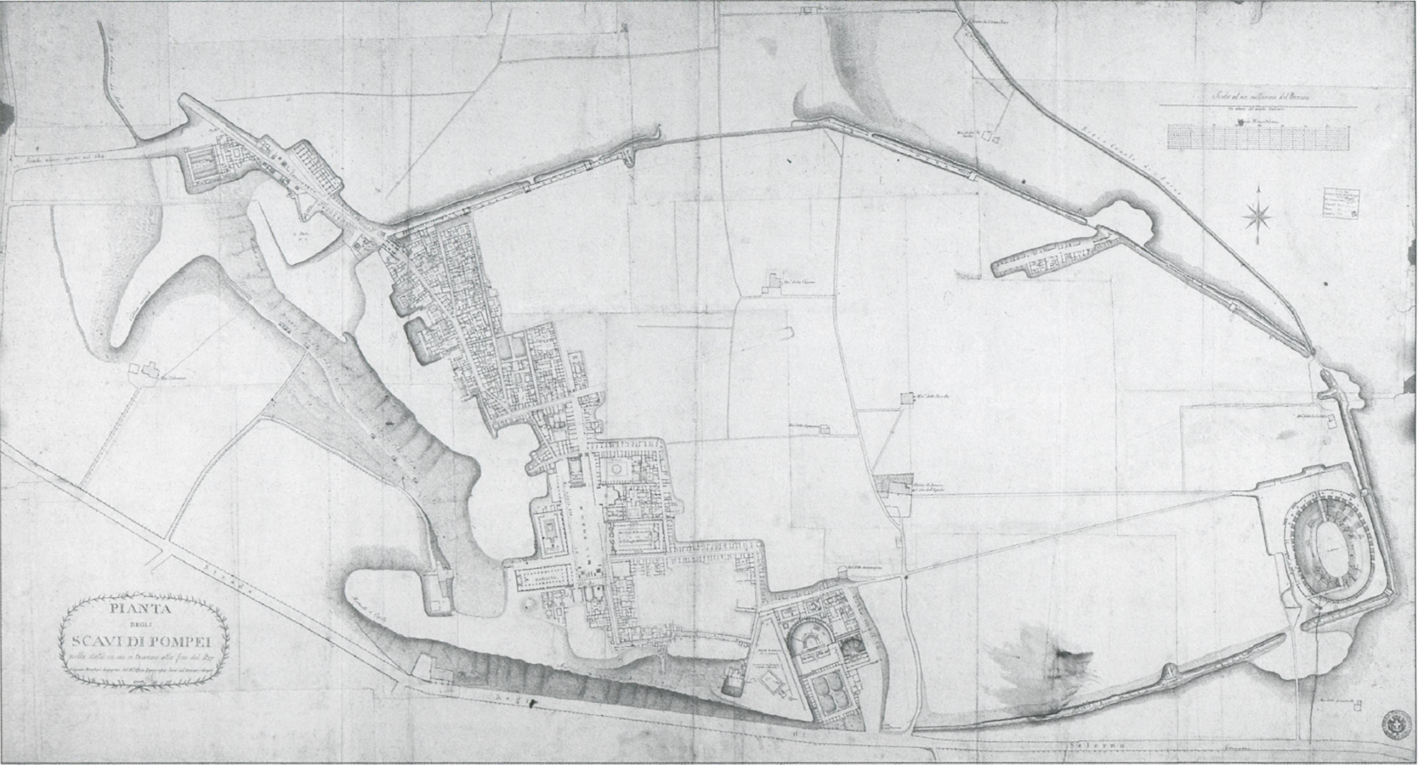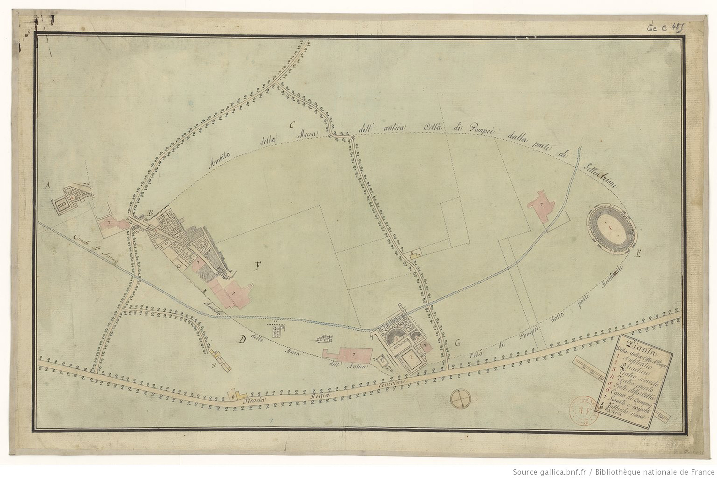 The first plan of Pompeii published in February 1776 by Francois-De-Paule Latapie. He drew the map from memory after visiting Pompeii, as such activities were not allowed during visits at that time, and made a presentation to l’Académie Reale di Scienzi, Lettere ed Arte de Bordeaux.