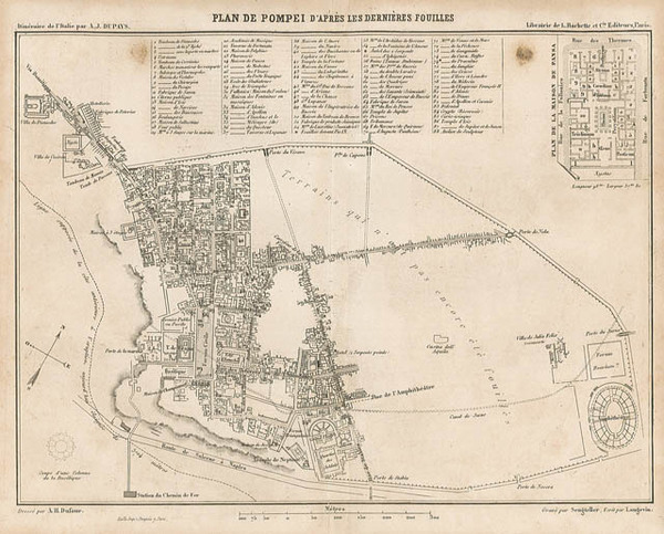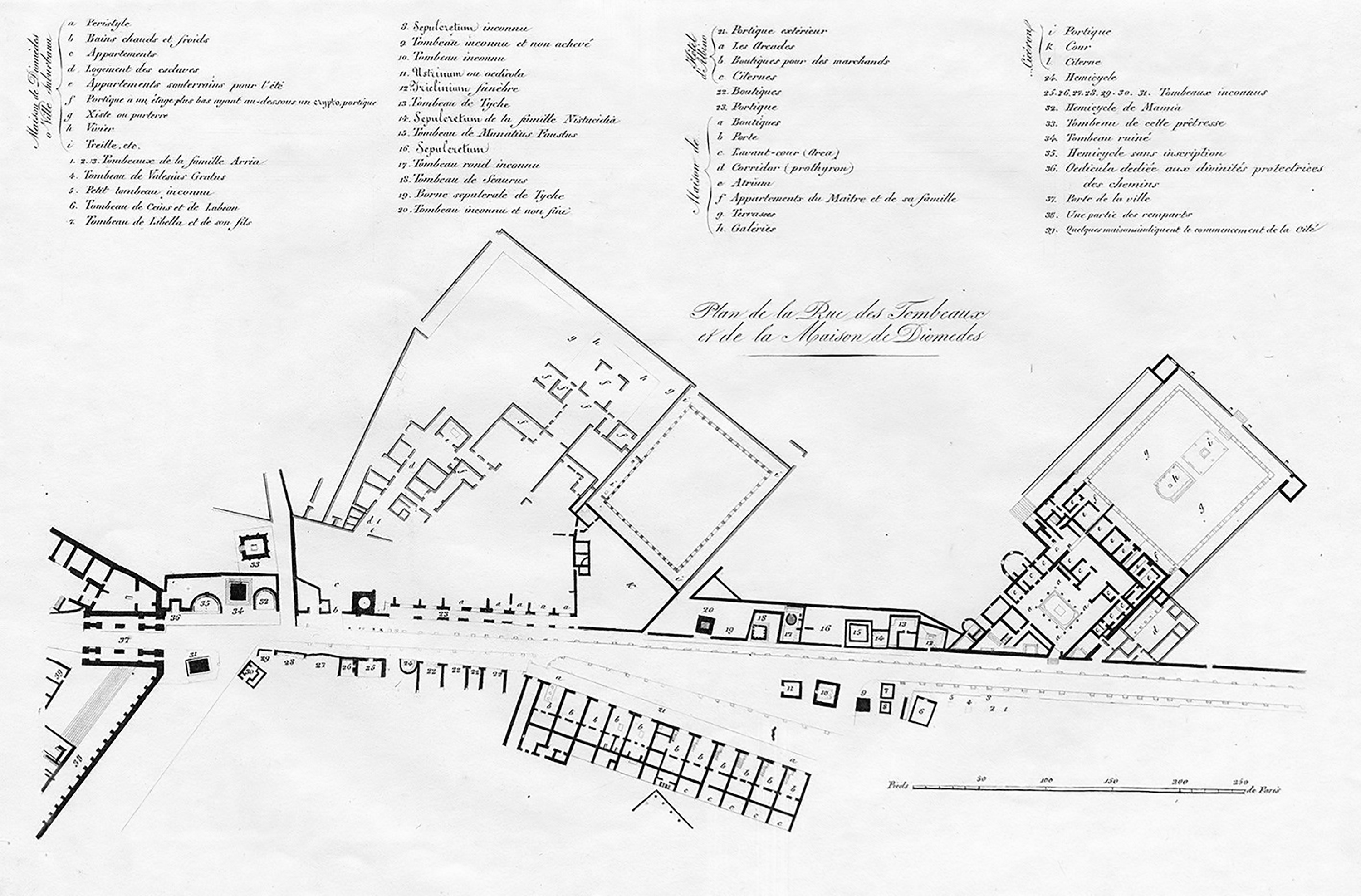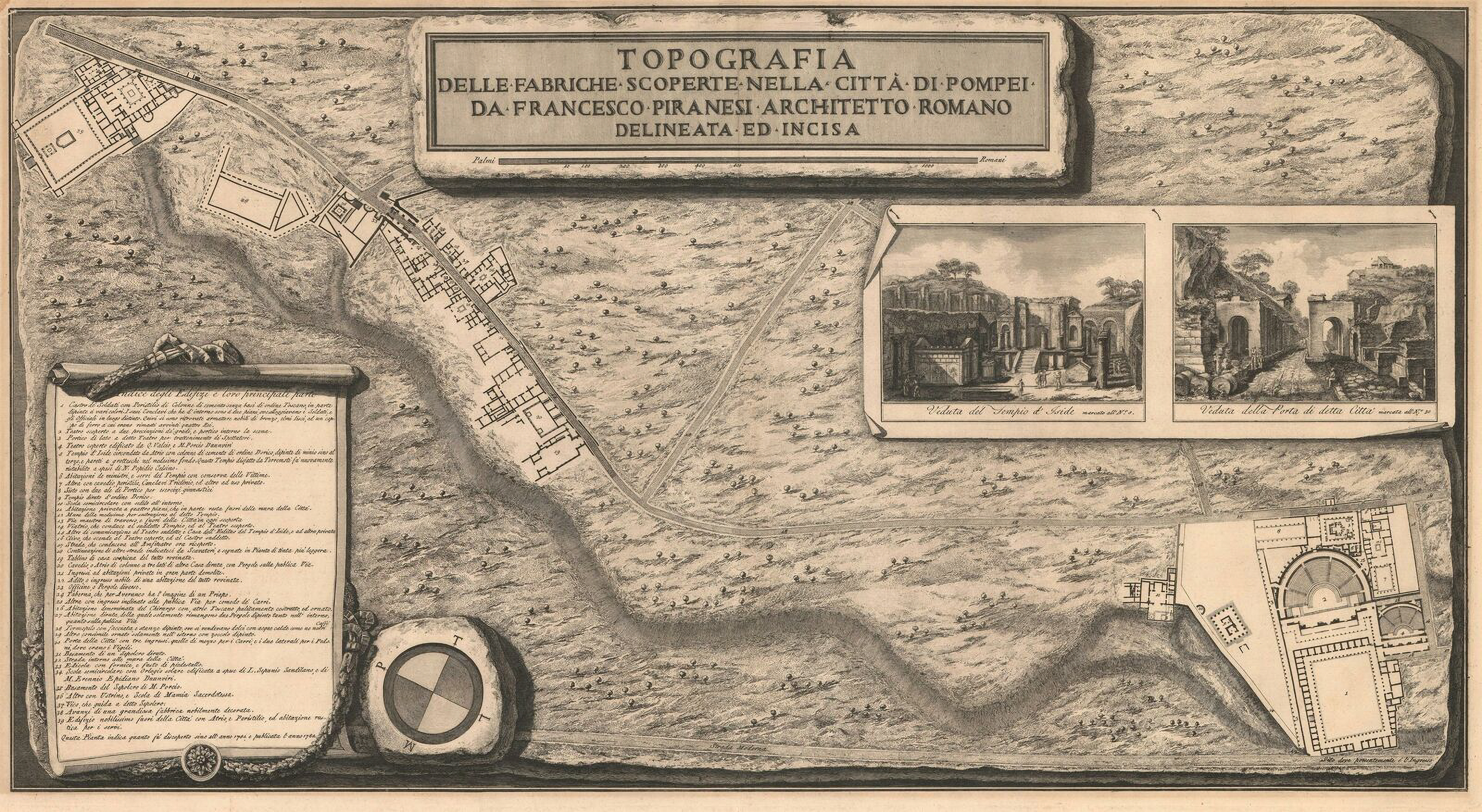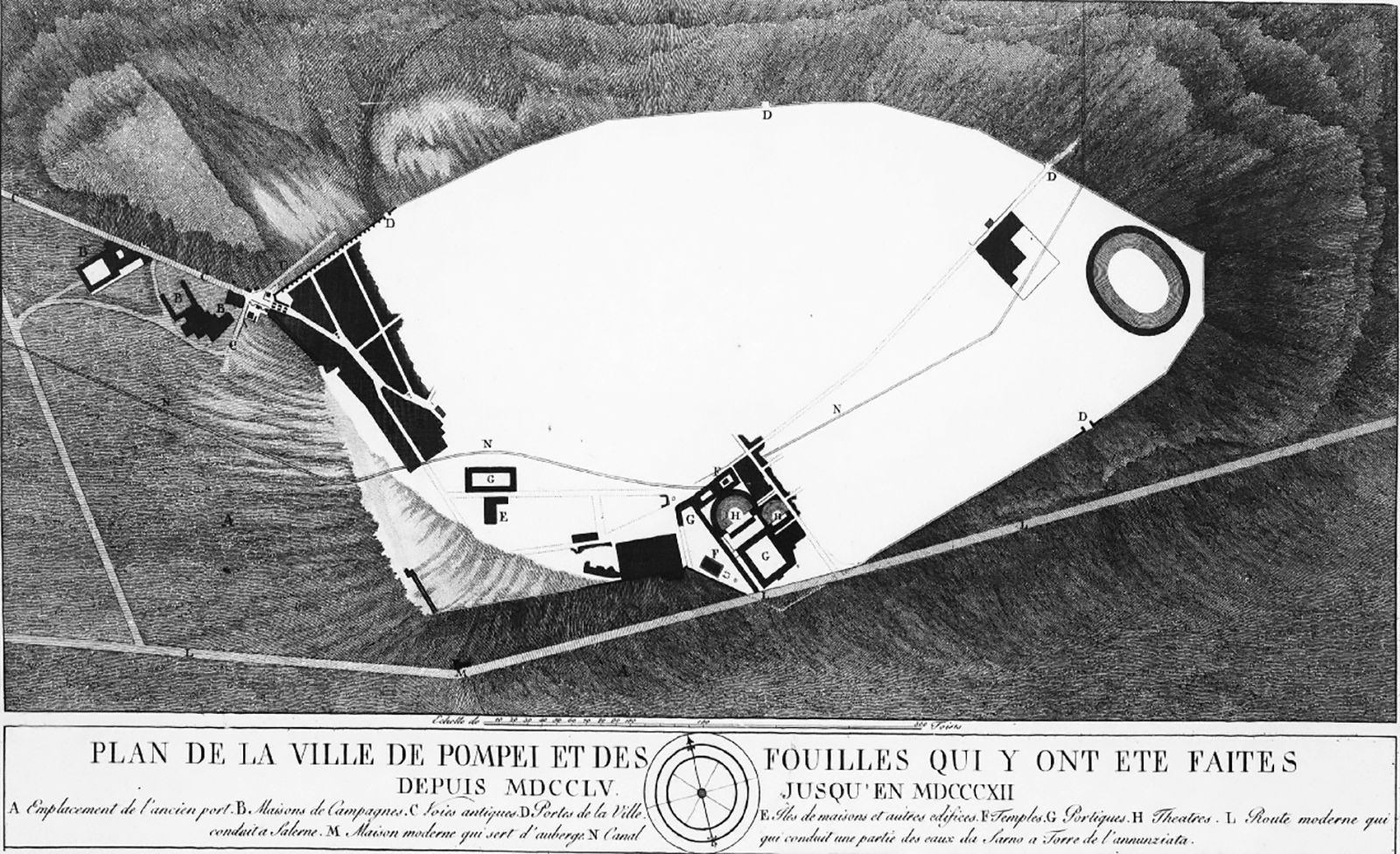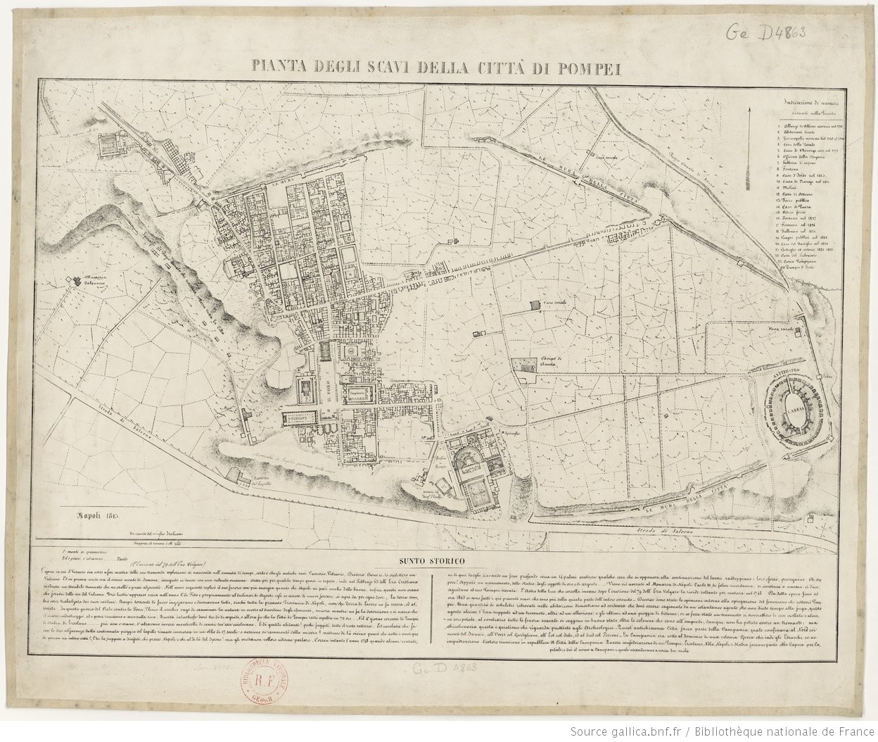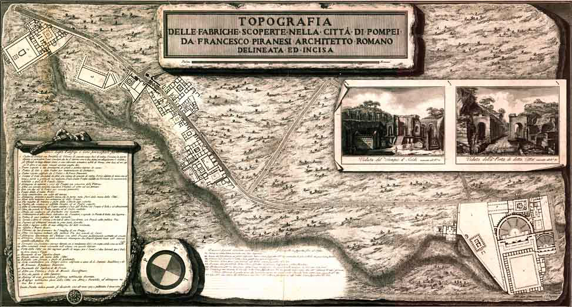 The first plan of Pompeii published in February 1776 by Francois-De-Paule Latapie. He drew the map from memory after visiting Pompeii, as such activities were not allowed during visits at that time, and made a presentation to l’Académie Reale di Scienzi, Lettere ed Arte de Bordeaux.