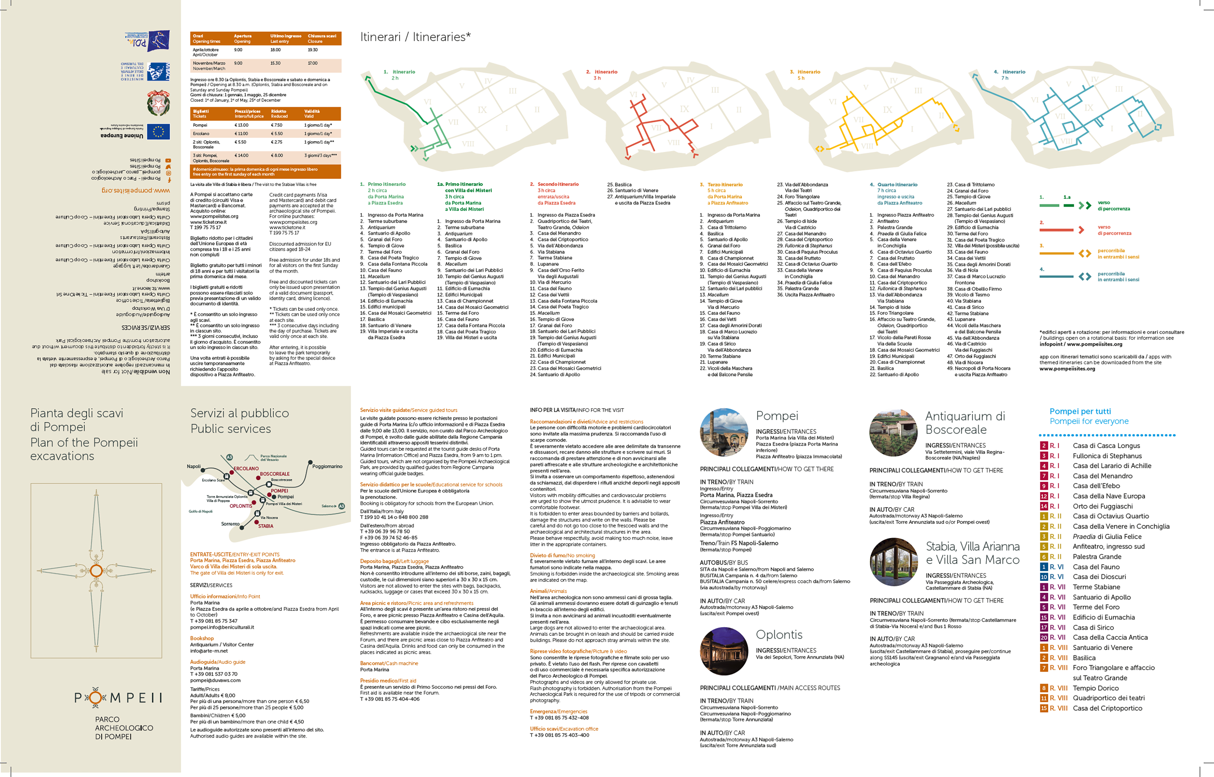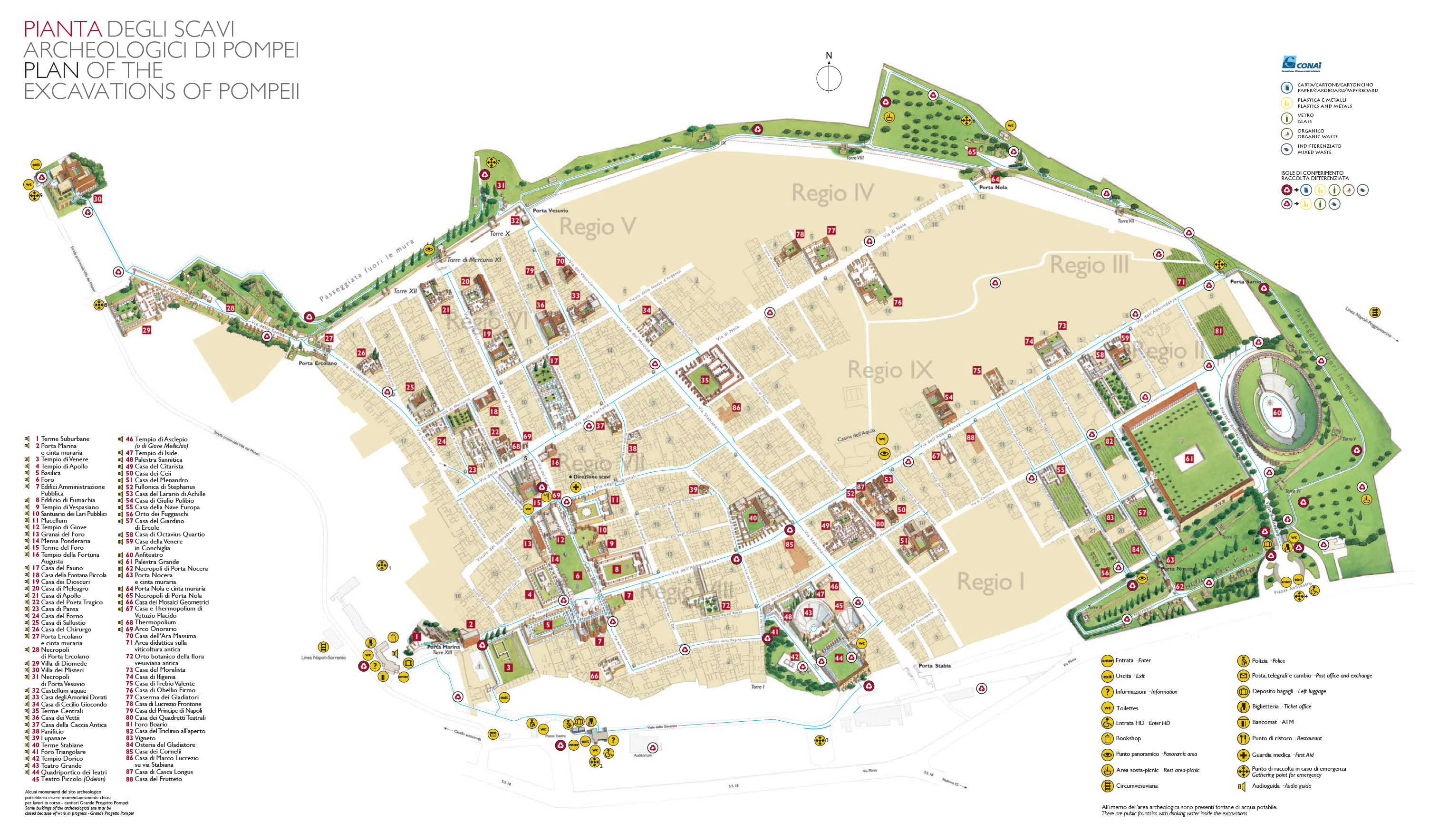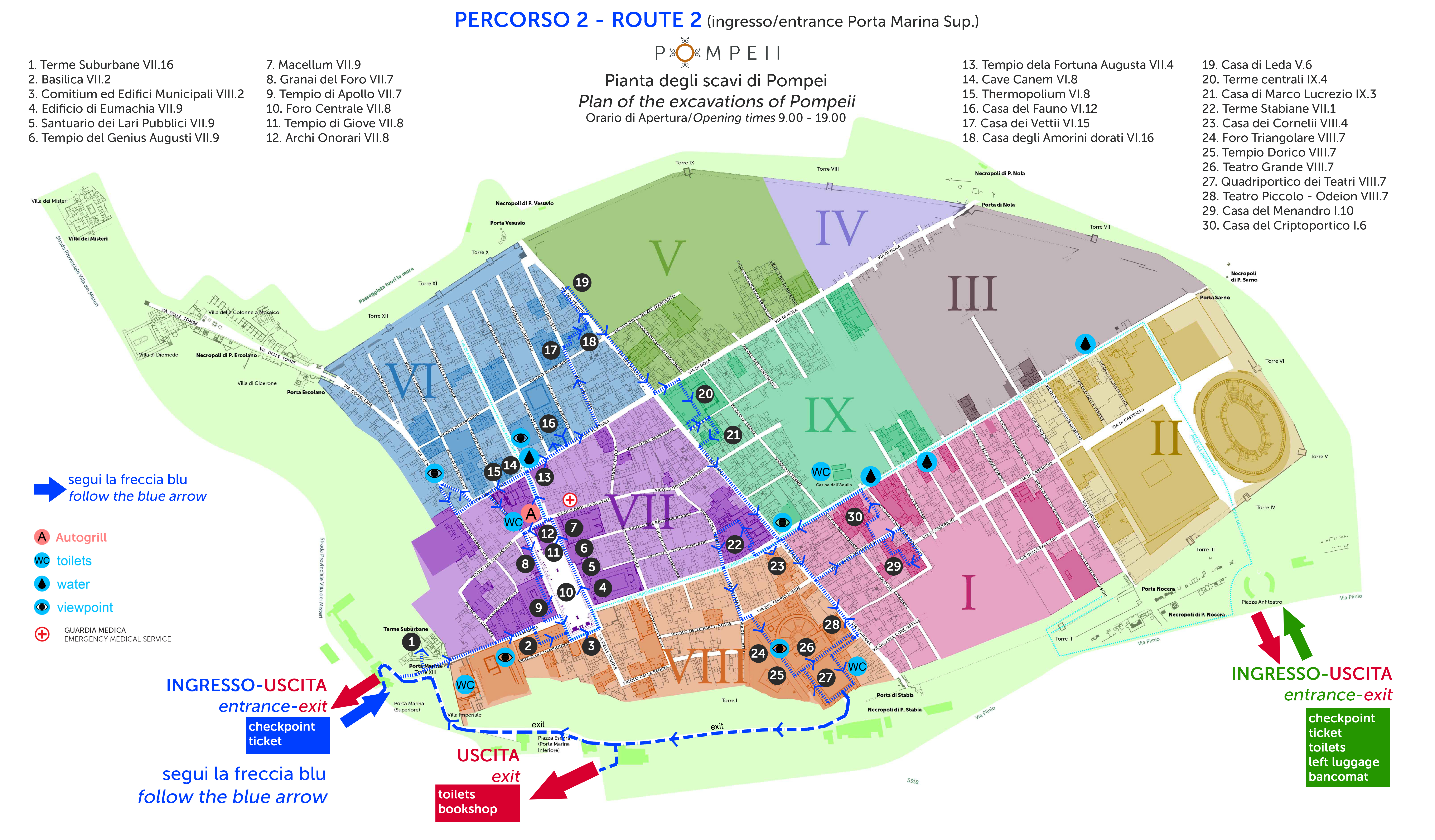 2019 Parco Archeologico di Pompeii tourist plan itineries showing the main buildings. Not all of these are currently open to the public.