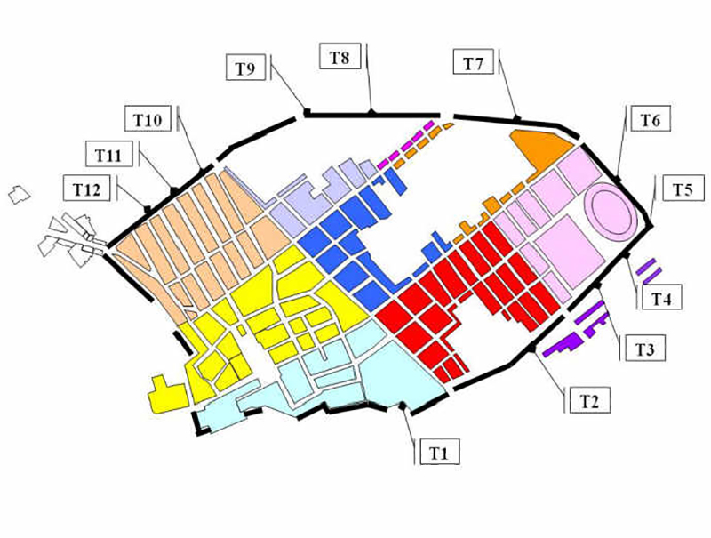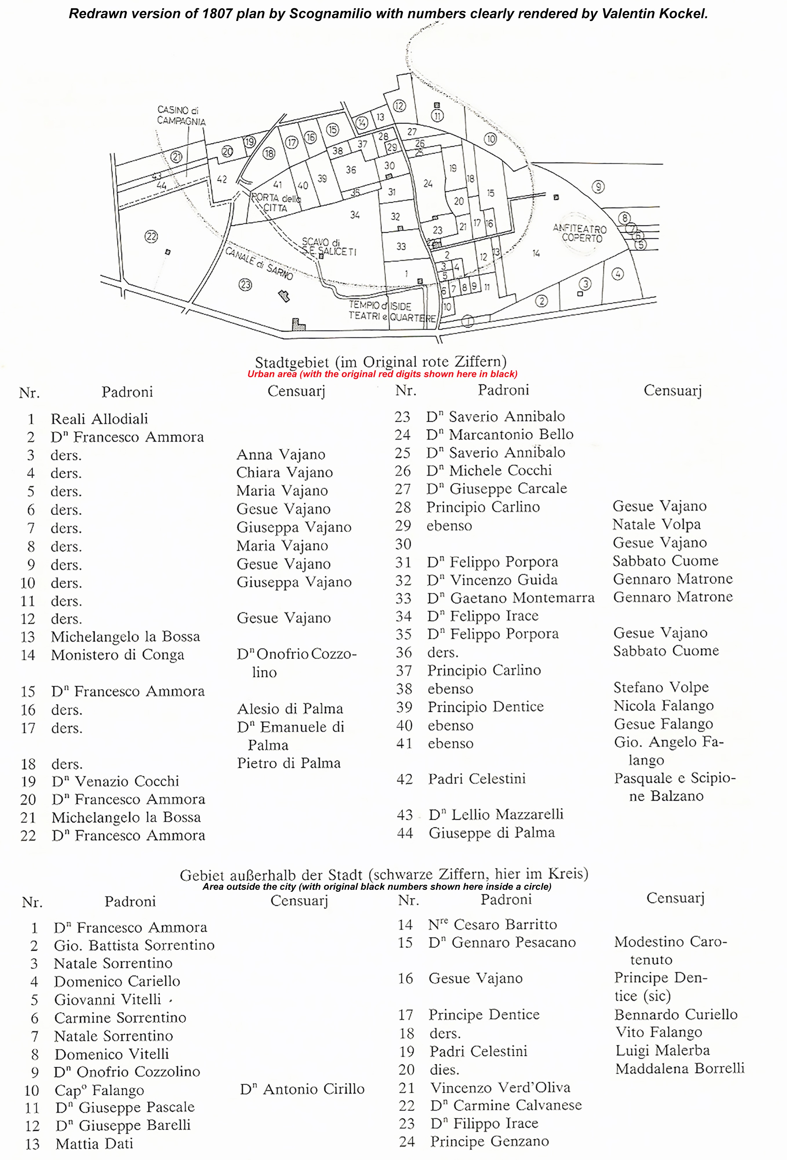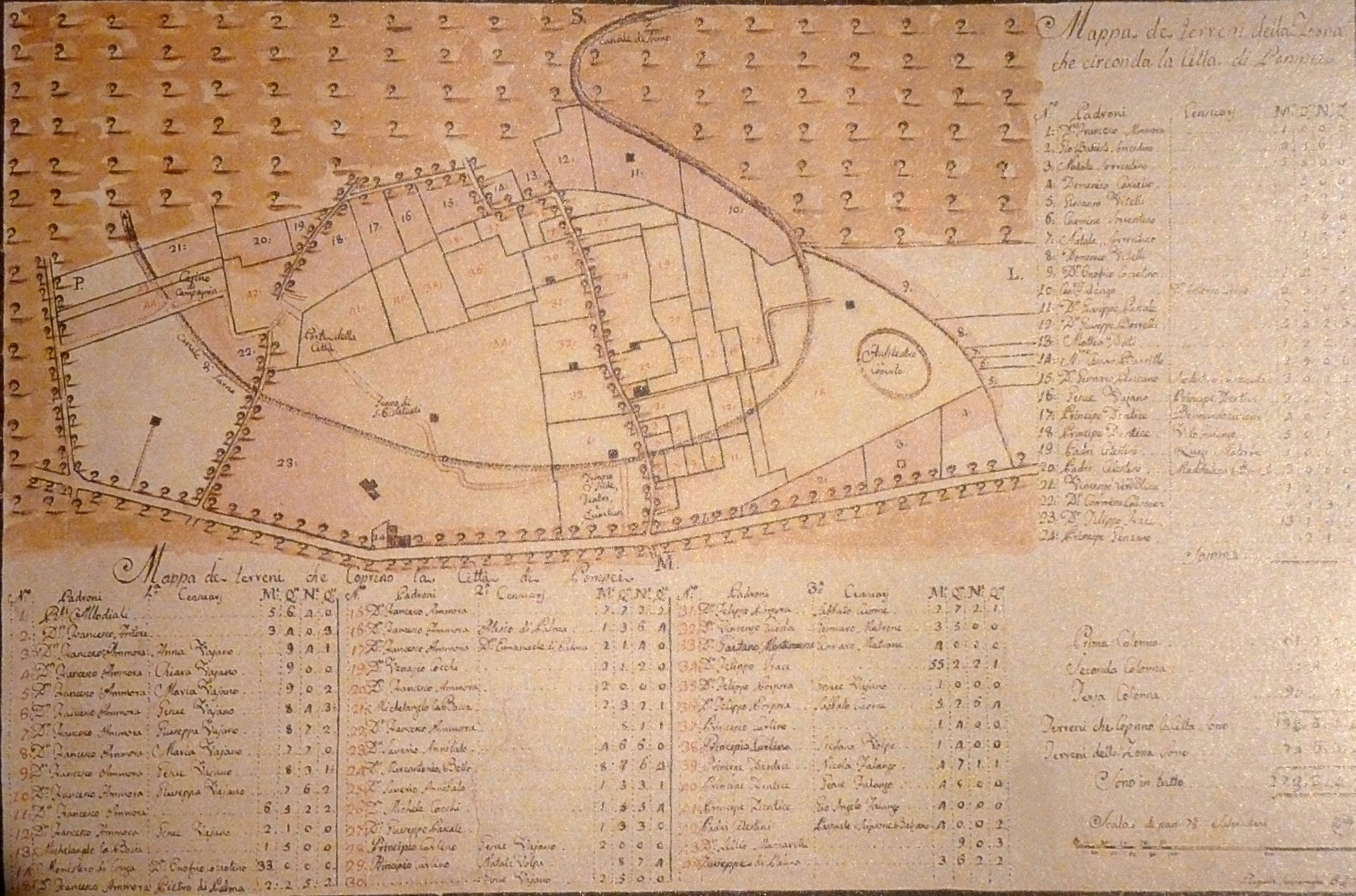 Redrawn plan, with clear numbers, of the land that covers the city of Pompeii on the plan drawn by Pasquale Scognamiglio, 1807.