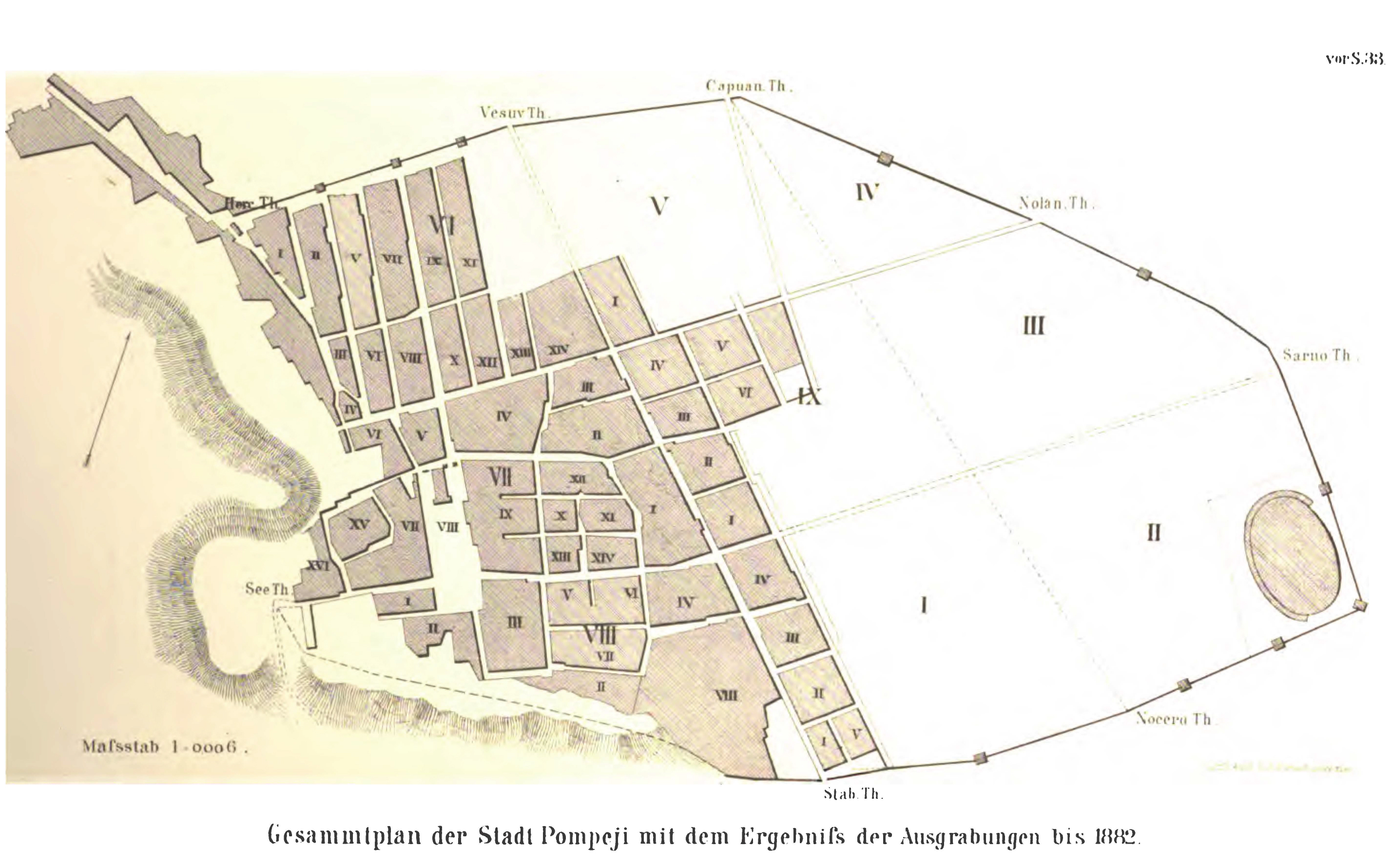 Gesamtplan der Stadt Pompeji mit dem Ergebnis der Ausgrabungen bis 1882.