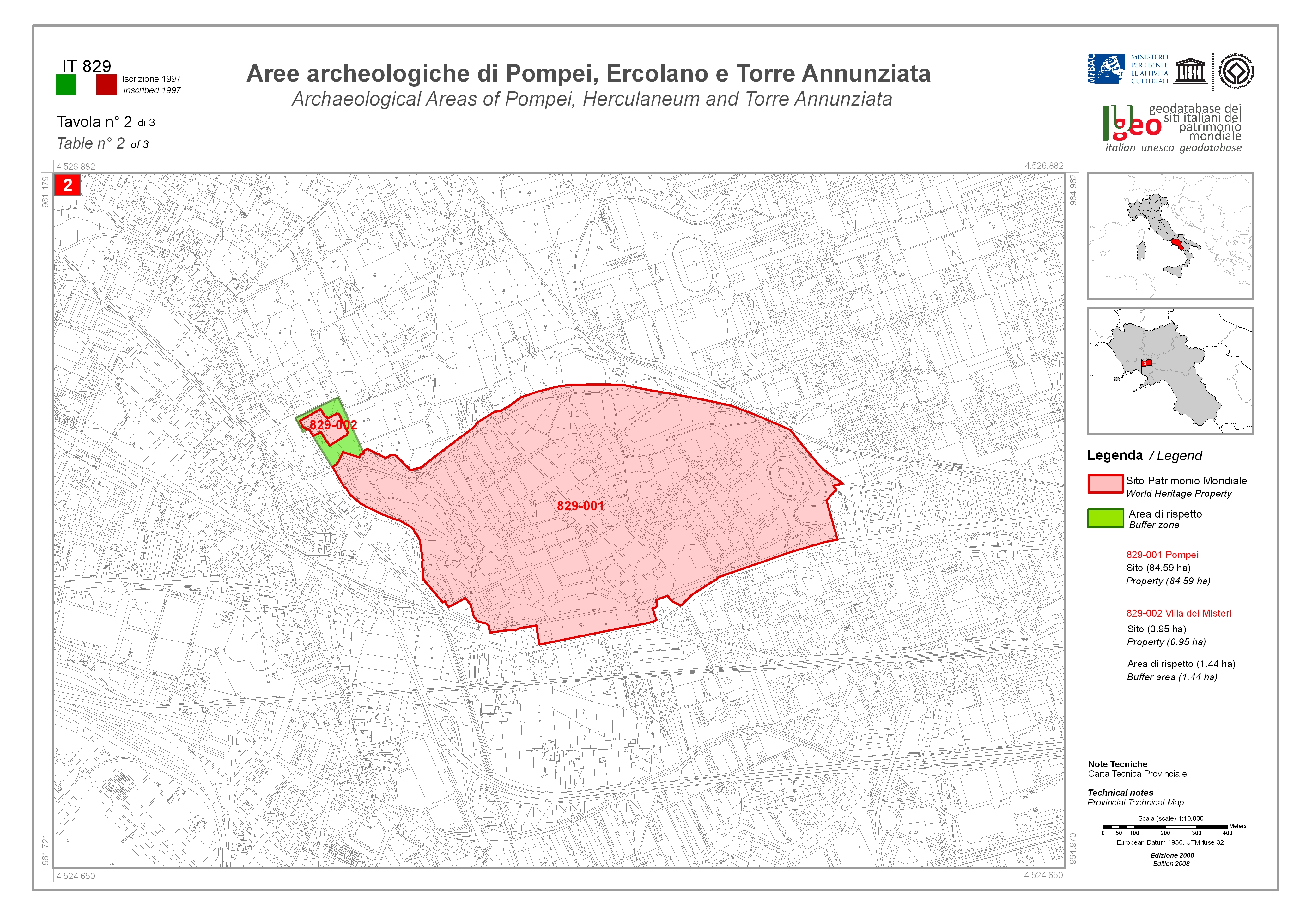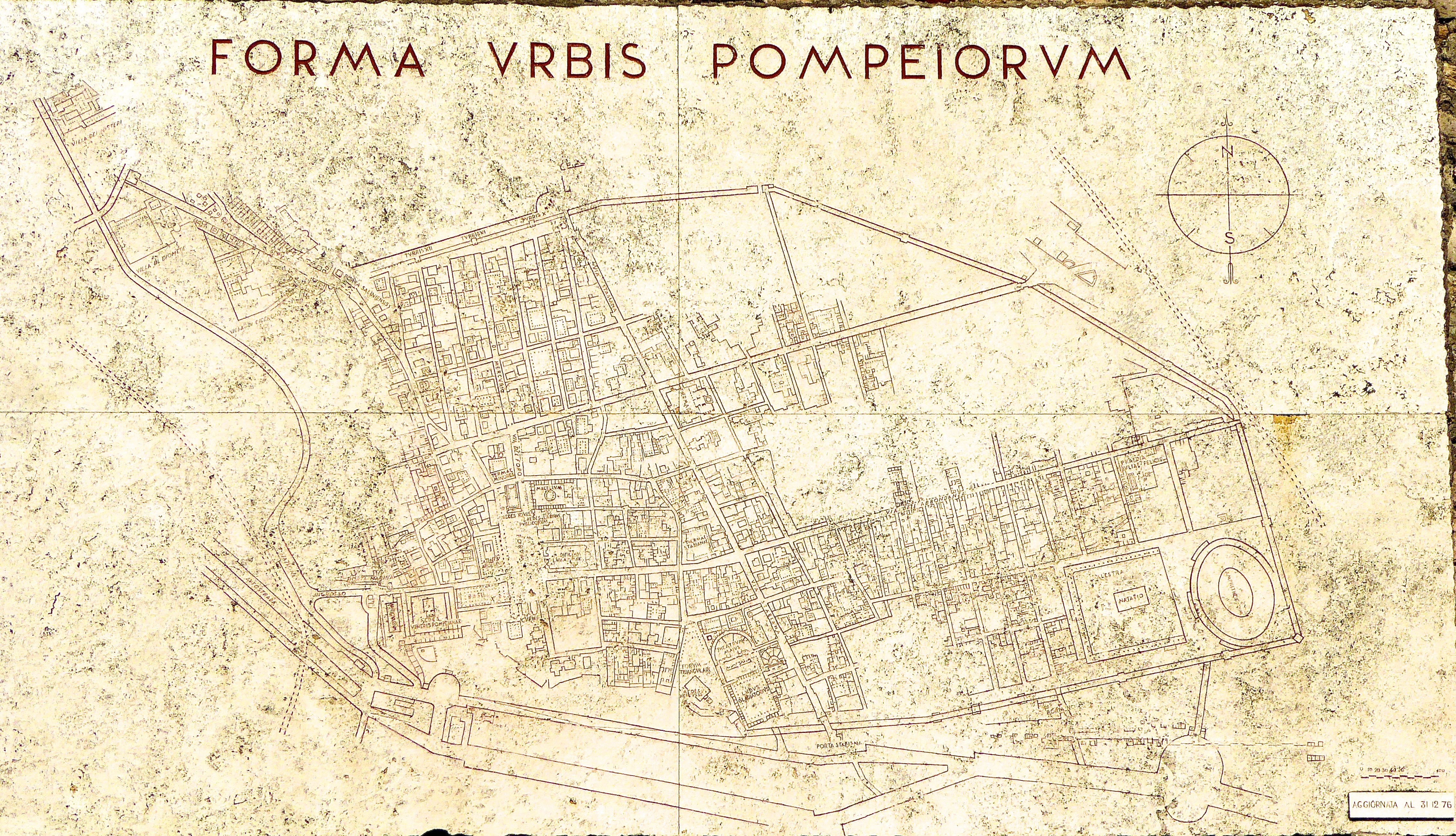 1947 plan of Pompeii entitled the FORMA VRBIS POMPEIORVM. This plan is cut onto a slab of travertine 5m wide by 2.73m high and was completed in 1947. It was installed in the Larario dei Pompeianisti located between the Porta Marina and the Antiquarium when the Larario was opened in 1948. It was updated on 31st December 1976. It can still be seen today as you enter or exit via the Porta Marina.