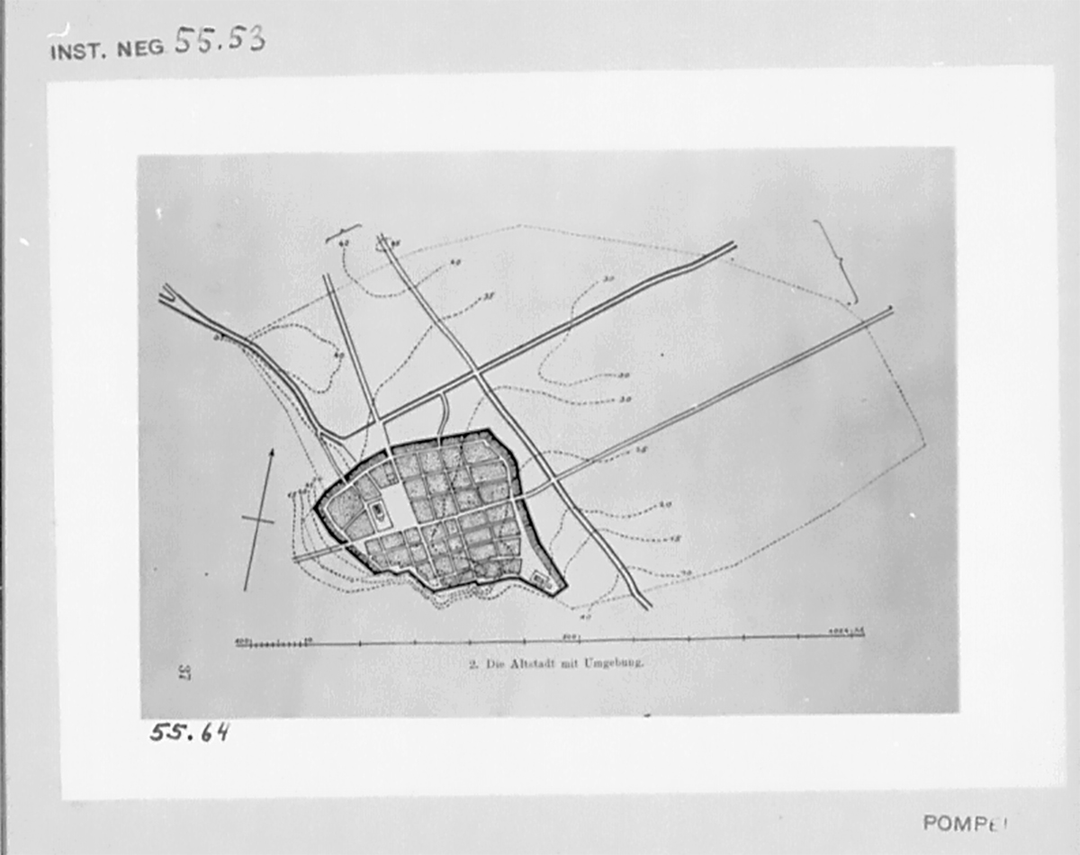 Plan of Pompeii received by the Deutsches Archäologisches Institut in 1955. It is a photo by Tatiana Warsher W.399 and in the inventory record it says it is copy by her of an original by A von Gerkan? The handwriting is hard to decipher. It may relate to the 1930s or up to 1955.