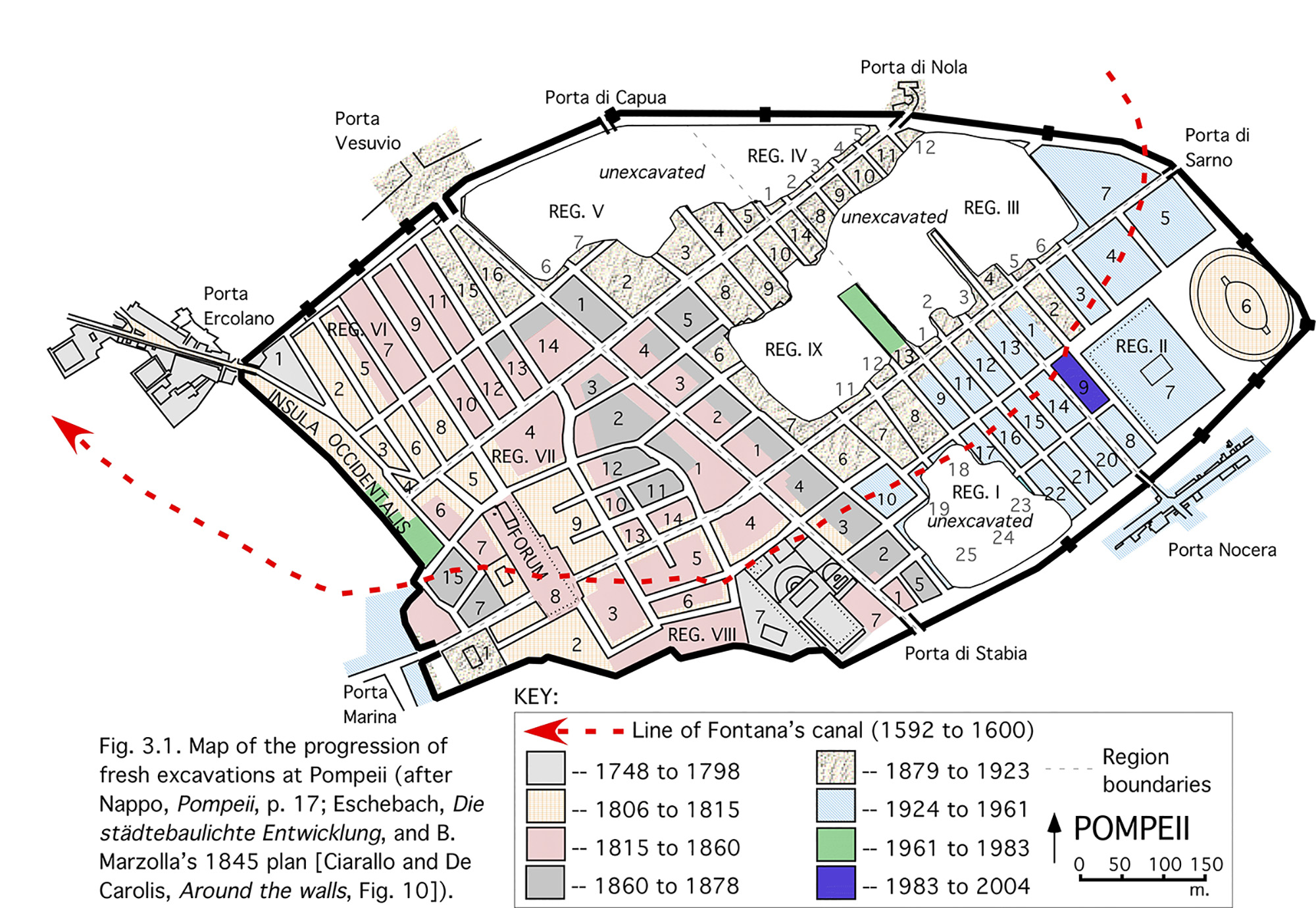 Plan of the excavated parts of Pompeii with overview of the main building periods and the levels 1875.