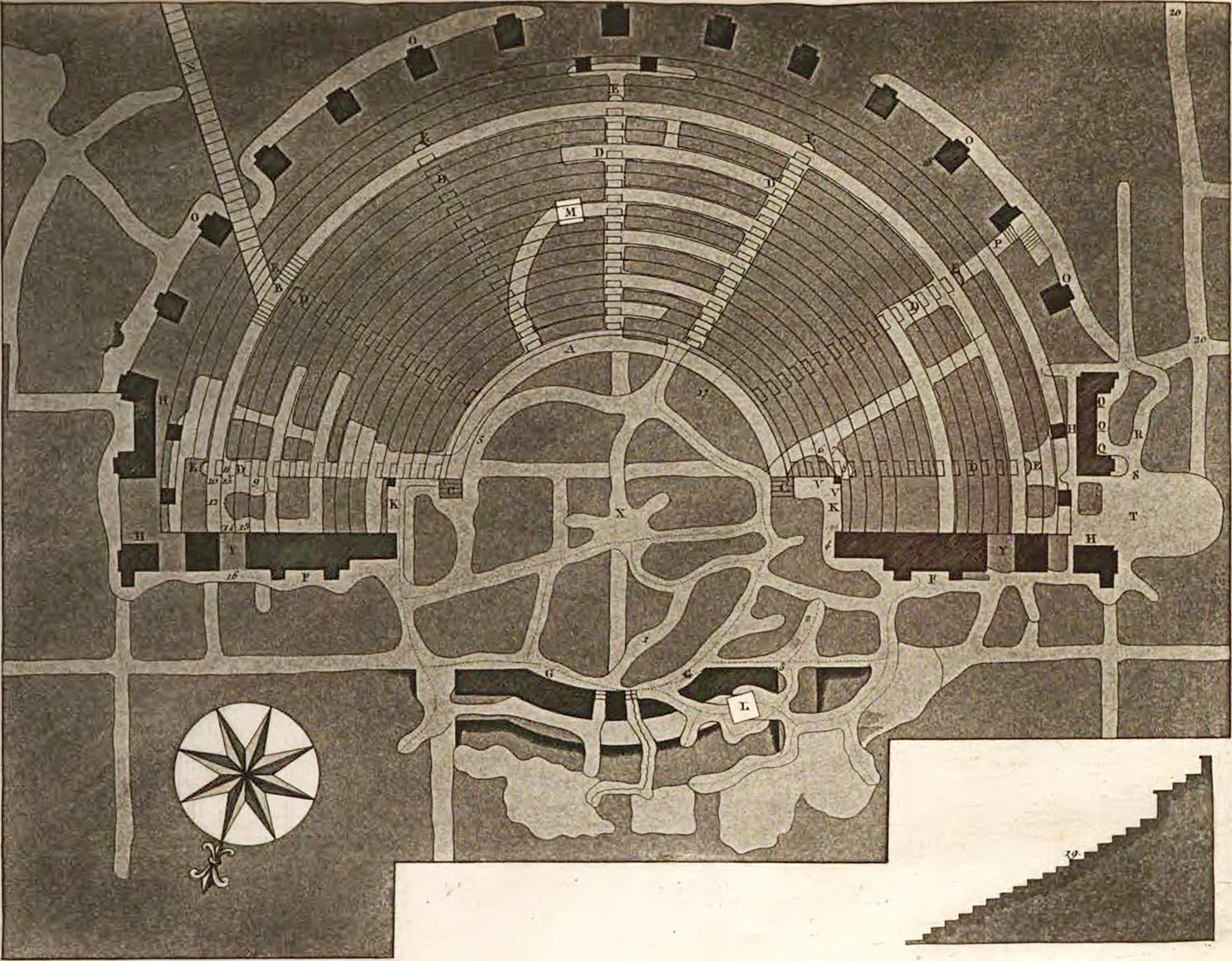 D. Sette scale in conformi divisioni nella semicirconferenza del teatro, per salir comodamente ai scalini o loro posti, e corrispondono queste scale dalla parte superiore ad altri sette vomitorii per facilitare l'uscita del popolo.